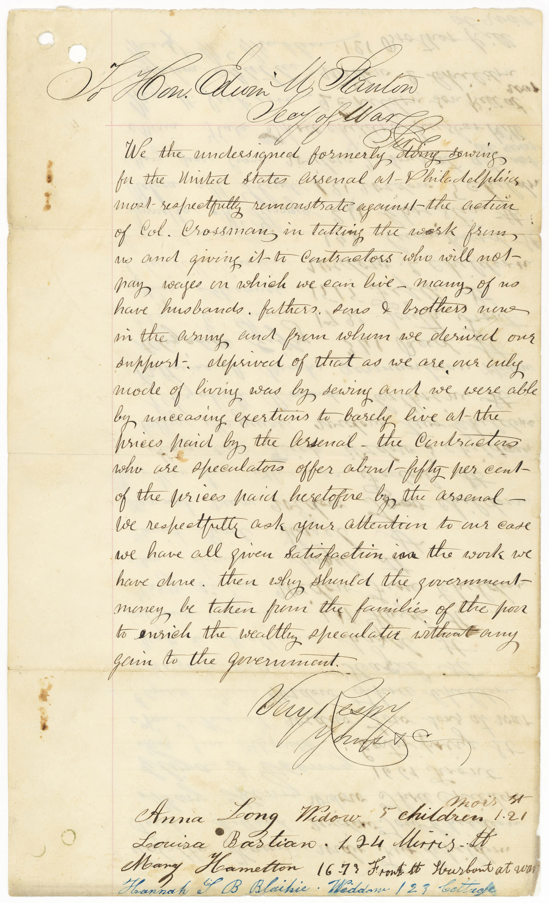 Seamstresses protest an injustice. A group of seamstresses working at the U.S. Arsenal in Philadelphia wrote this letter to the Secretary of War in 1862 to most respectfully remonstrate about work that had been taken from them and given to a contractor. The contractor paid only about half what the women previously received. Since many of the women had husbands, fathers, and sons in the Army, their wages were their sole means of livelihood. National Archives, Records of the Office of the Quartermaster General