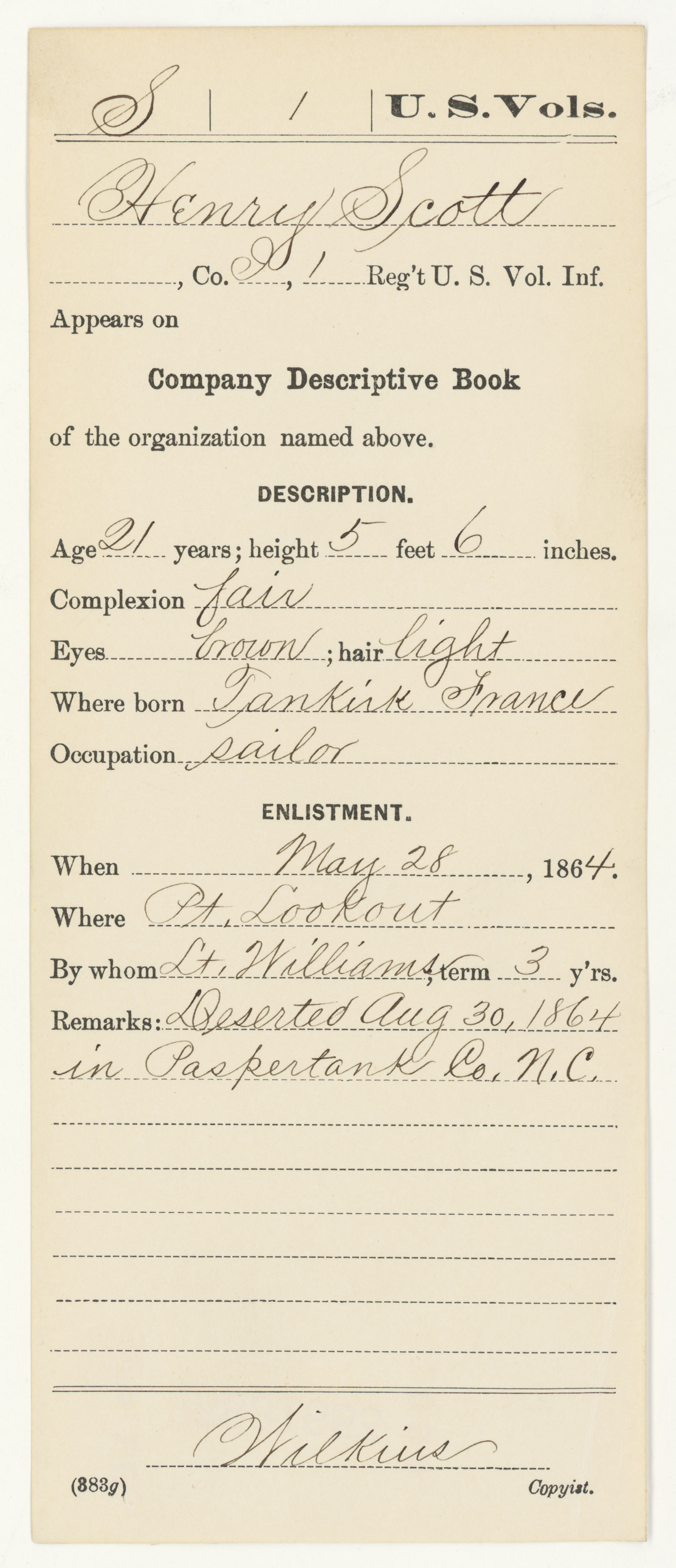 These two service cards show that Private Henry Scott served in both armies. He originally joined the Confederate 10th Louisiana Infantry, where he fought at Chancellorsville, Gettysburg, and the Wilderness. He was captured at Spotsylvania in May 1864 and taken to a prisoner-of-war camp at Point Lookout, Maryland. He then took the oath of allegiance for the United States and joined the 1st U.S. Volunteer Infantry. He deserted soon after on August 30, 1864. National Archives, Records of the Adjutant General's Office, 1780's-1917