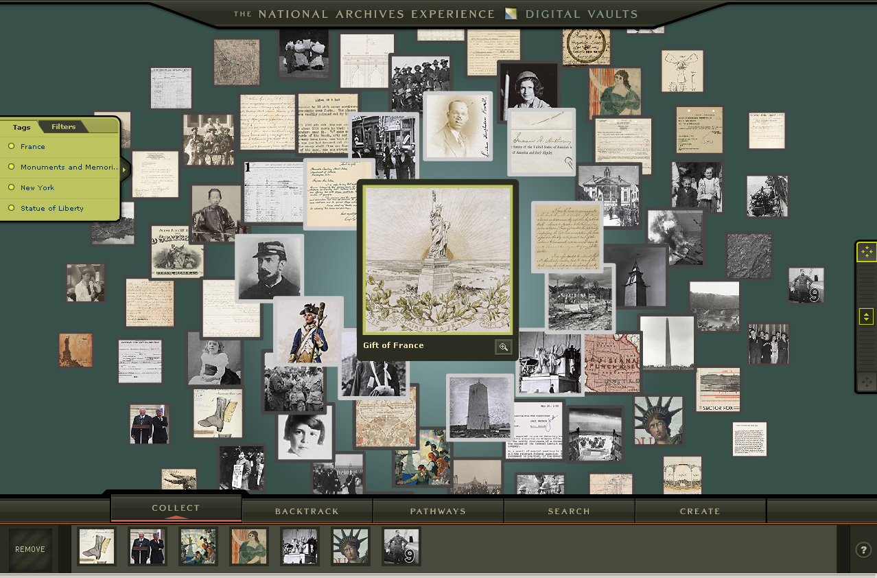 Washington, DC… 2014 - The National Archives new "Digital Vaults" exhibit delivers an online experience that is unlike any other. With a database of some 1,200 documents, photographs, drawings, maps, and other materials and a keywording system that visually links records, the Digital Vaults enables visitors to customize their exhibit experience and to create posters, movies, and games that can be shared by email. Each record in Digital Vaults is also linked to the National Archives Catalog, so visitors who want to know more can take the first steps toward a research journey into the National Archives.