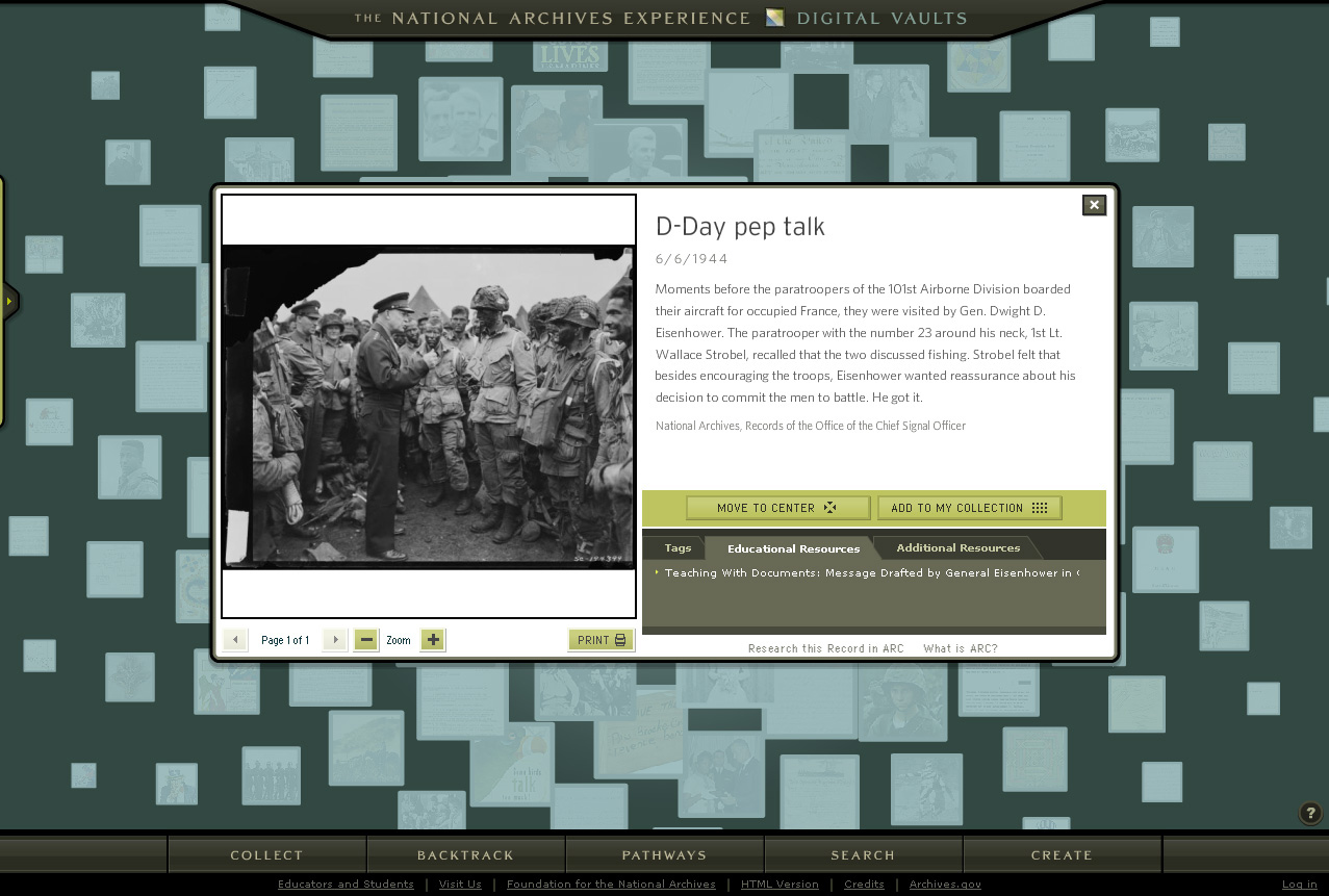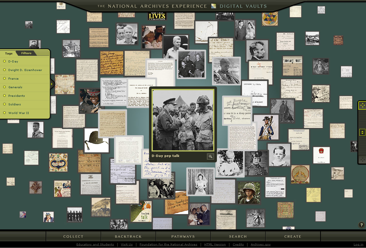 Digital Vaults is part of a redesigned National Archives Experience web site that provides the inside story of the award-winning Public Vaults exhibition, the changing exhibitions in the Lawrence F. O’Brien gallery, the educational offerings of the Boeing Learning Center, National Archives public programs, information about the National Archives Foundation, and much more.