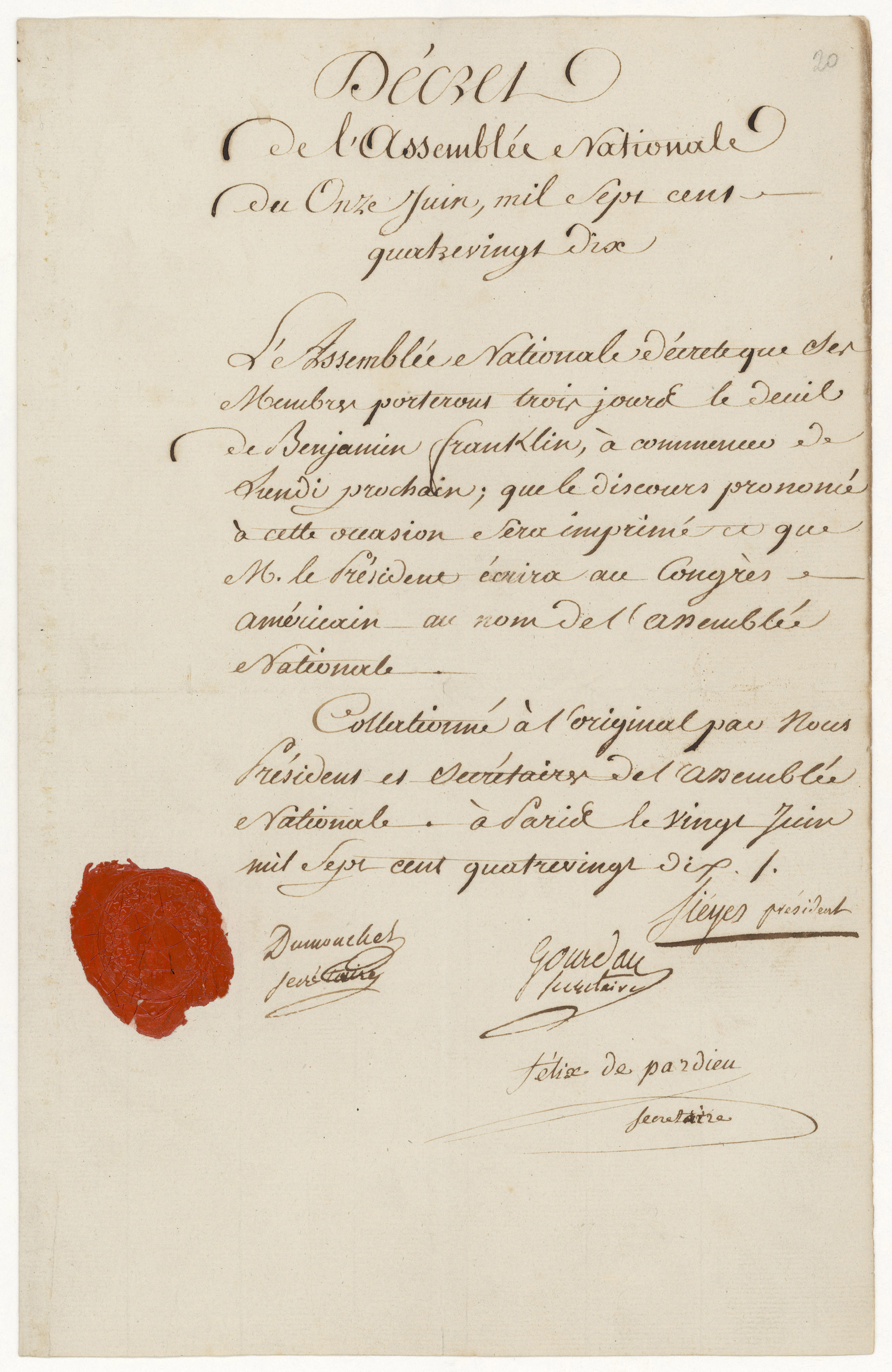 Decree of French National Assembly on the death of Franklin [RED 23133]