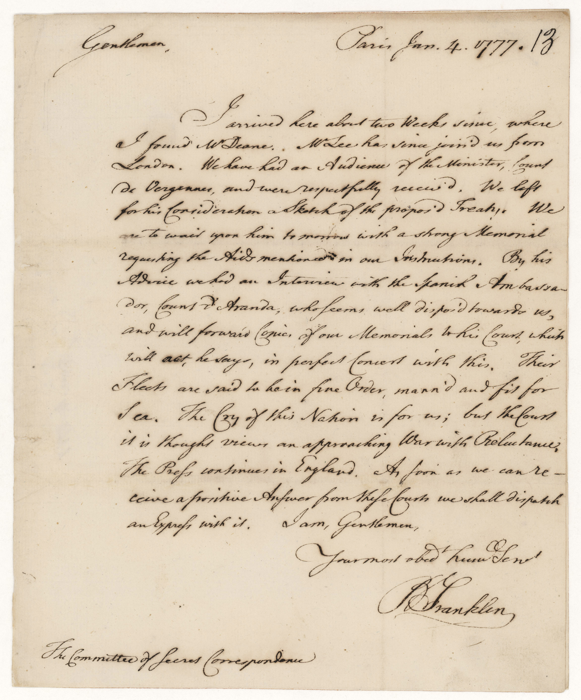 Letter from Franklin to Secret Correspondence Committee, January 4, 1777 [RED 20559]