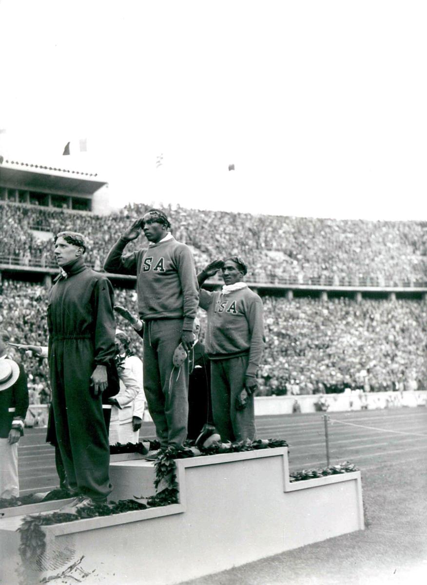 Jesse Owens after winning the gold medal in the 100-meter sprint. Behind him is his teammate, silver medalist Ralph Metcalfe. 1936. National Archives, Collection of Foreign Records Seized
