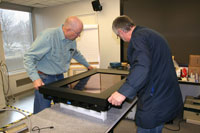 NIST Engineering Technician Brian Yanick (left) and Mechanical Engineer Jay Brandenburg (right) inspect the platform geometry between machining operations. Image by Mark Luce for NIST.