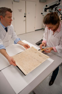 National Archives conservators Terry Boone (right) and Morgan Zinsmeister (left) examine the condition of 1297 Magna Carta before proposing treatment steps. Image by Sheri Hill for the National Archives.