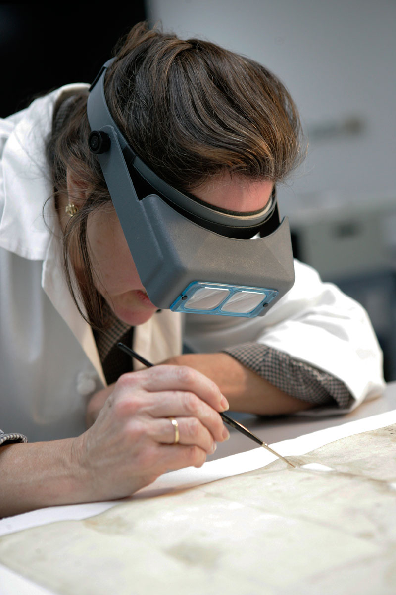 National Archives conservator Terry Boone tests the solubility of old adhesive residues on the reverse of Magna Carta. Image by Sheri Hill for the National Archives.