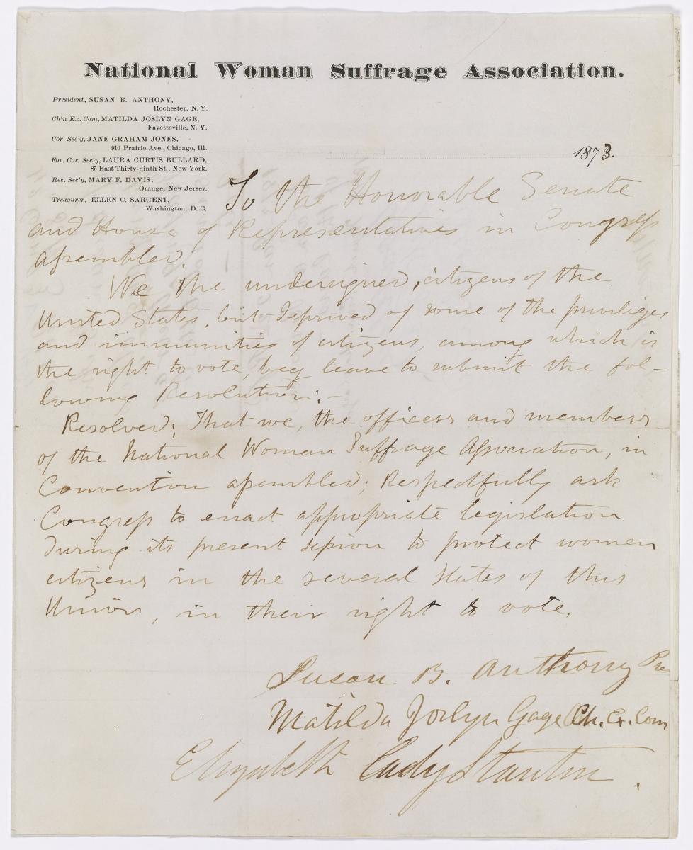An 1873 petition signed by NWSA founders Elizabeth Cady Stanton and Susan B Anthony urging Congress to pass legislation giving women the right to vote. (National Archives, Records of the U.S. Senate)