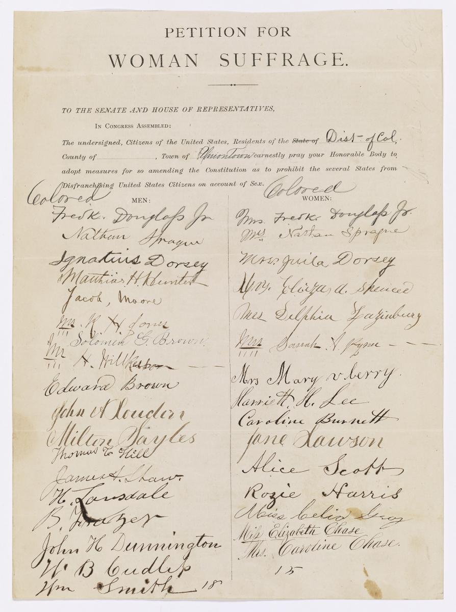 Petition signed by Frederick Douglass, Jr., and Rosetta Douglass (Mrs. Nathan Sprague) asking Congress “to prohibit states from disfranchising United States citizens on account of sex.” (National Archives, Records of the U.S. House of Representatives)