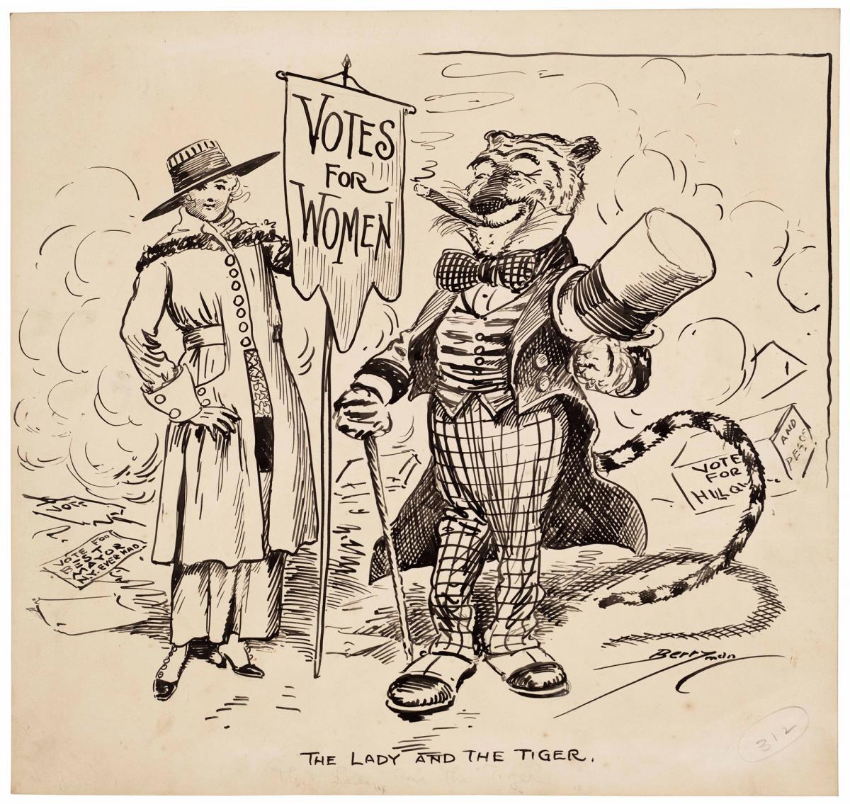 A political cartoon by Cllifford Berryman shows a suffragist with the “Tammany Tiger,” which represents New York City’s political machine. (National Archives, Records of the U.S. Senate)