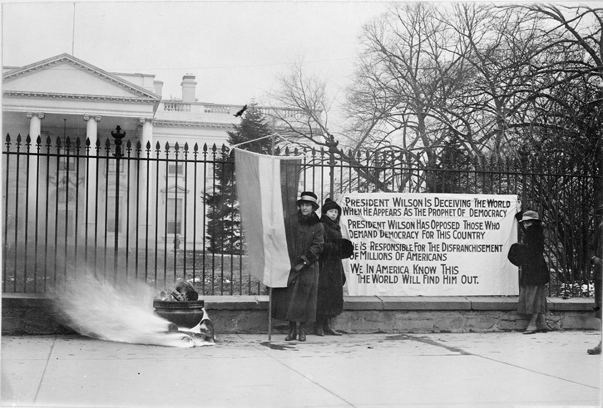 Suffragists with poster and bonfire at the White House, Washington, DC, 1918. (National Archives, Records of the U.S. Information Agency)