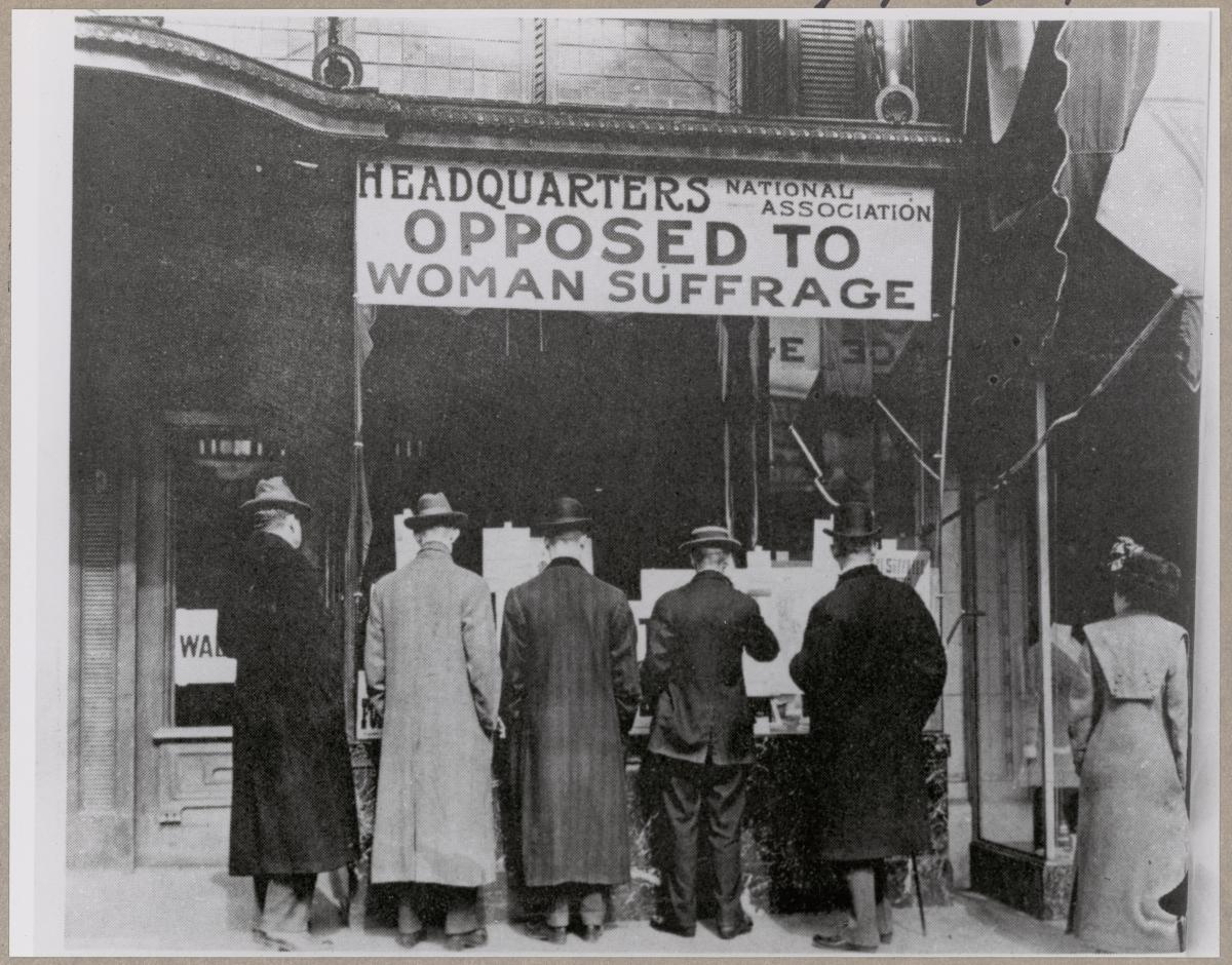 Passers-by at the Headquarters of National Association Opposed to Woman Suffrage, ca. 1919. (National Archives, Records of the U.S. Information Agency)