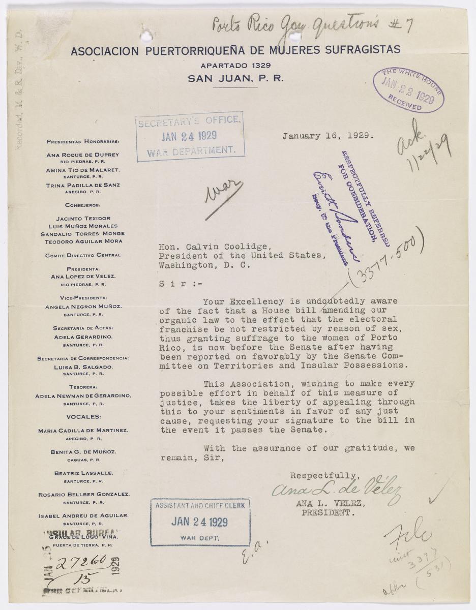 In 1929, the president of the Asociacion Puertorriqueña de Mujeres Sufragistas, Ana López de Vélez, wrote to President Calvin Coolidge, urging his support for enfranchising Puerto Rican women. (National Archives, Records of the Bureau of Insular Affairs)