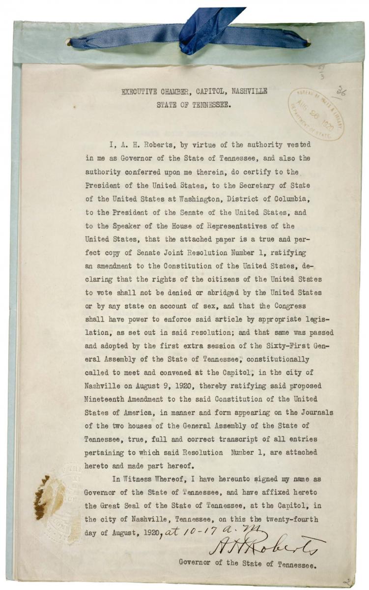 Tennessee's ratification of the 19th Amendment (National Archives, General Records of the United States Government)