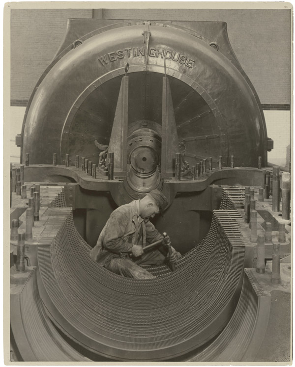 How We Worked - Photographs show workers posing heroically with their tools and as the symbolic "heart of the turbine." These pictures also reveal the effect of technology and automation as operatives sit along assembly lines, labor in typing pools, or work amid the sounds of machinery around them.