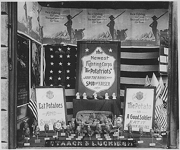 Potatriots, ca. 1917-18 This inventive store display ca. 1917 -18 promotes the potato as a "good soldier" and recommends people eat it — uniform and all.