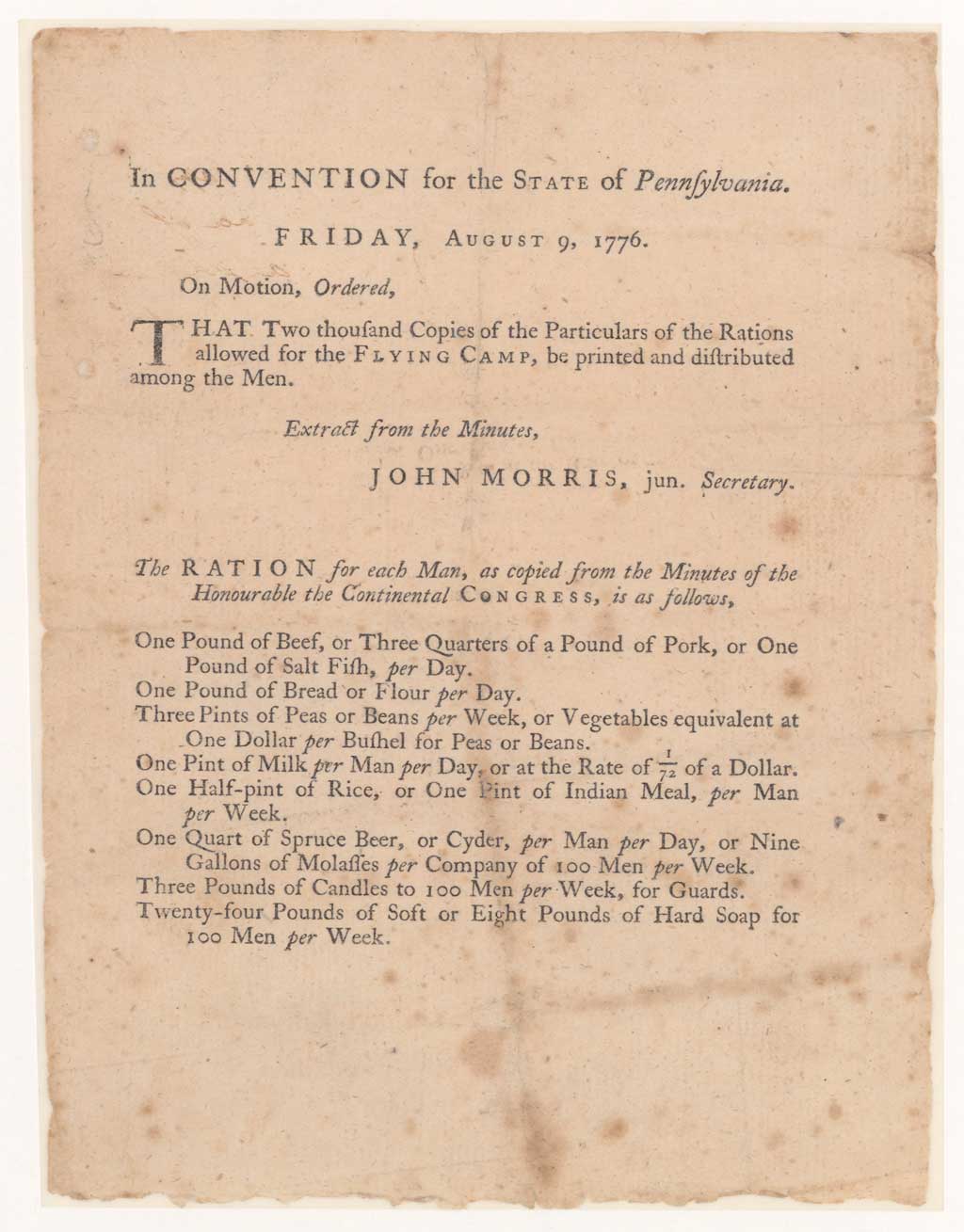 Flying Camp Rations Broadside, 1776 The Revolutionary War rations promoted in this broadside included one pint a day of spruce beer, a drink made from spruce tips and molasses thought to prevent scurvy. For colonists not fully motivated by cries of "Freedom," the promise of generous rations was a major incentive to enlist.