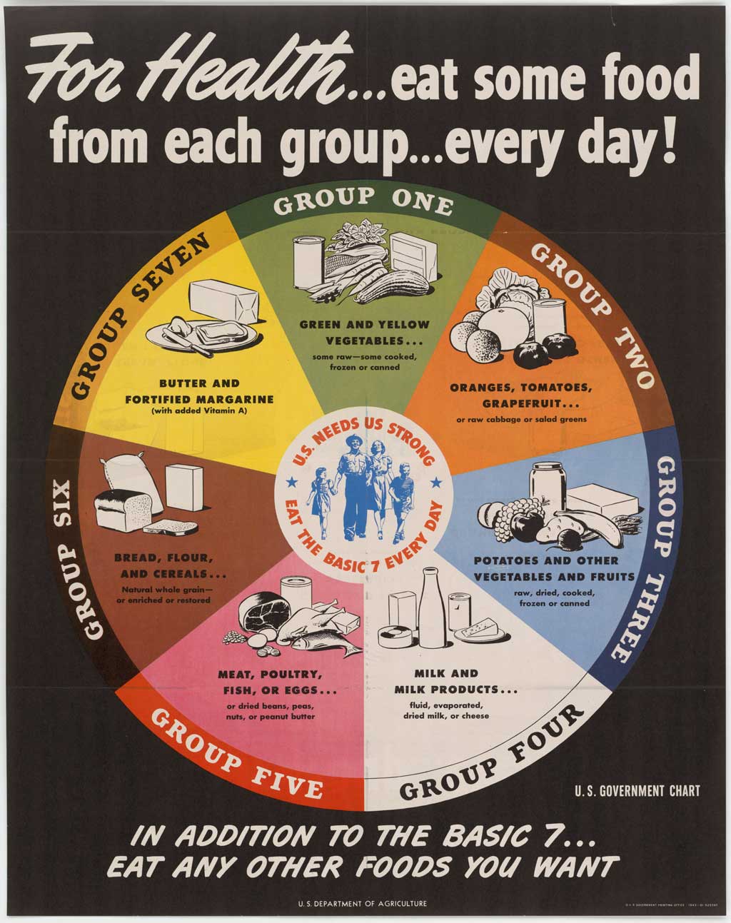United States Department of Agriculture Nutrition Chart, 1943 Some of us might like to reinstate this food guide from World War II because butter has its own food group.