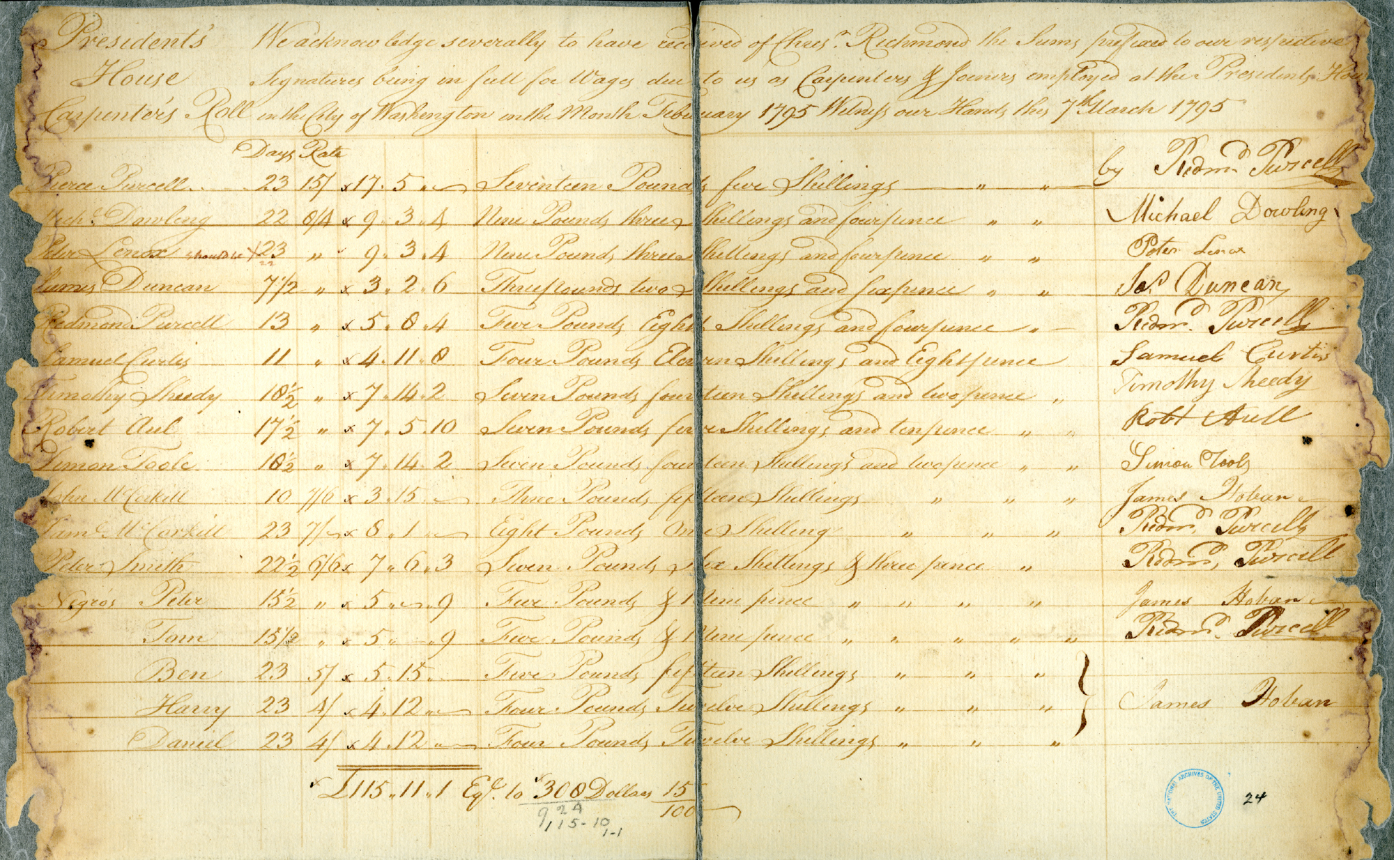 Wage rolls preserved at the National Archives list the African Americans who worked on these projects as carpenters and brickmakers. One such roll is a 1795 "Carpenter's Roll" for the President's House. The document lists four slaves, "Tom, Peter, Ben, [and] Harry," two of whom were slaves owned by James Hoban, the architect of the President's House. The rolls record the number of days worked and the rate at which each person was paid. A slave's wages were paid directly to the slave owner who signed the rolls as receipt of payment.