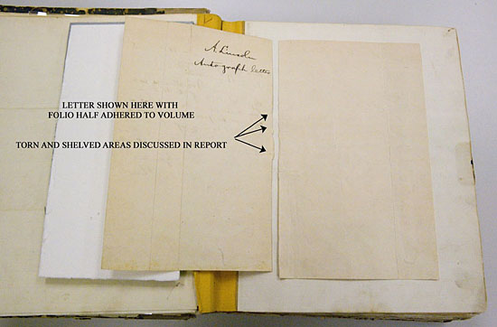 When the folio was torn along its fold, small portions of the upper most layers of the paper support were torn from page three, leaving behind matching indentations commonly referred to as “beveled” or “shelved” areas. The small portions of the support that remain attached along the folio fold (pages one and two) exactly match the shelved areas on the remaining folio half (pages three and four) adhered in the RG 56 volume. They would fit together exactly if reattached. Please refer to the accompanying photographic evidence that illustrates this point.
