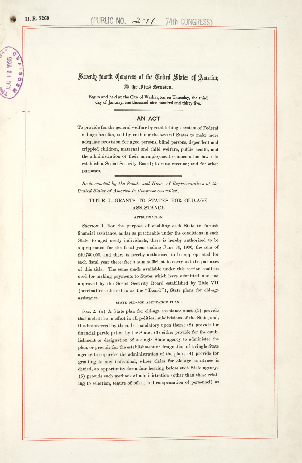 On August 14, 1935, the Social Security Act established a system of old-age benefits for workers, benefits for victims of industrial accidents, unemployment insurance, aid for dependent mothers and children, the blind, and the physically handicapped.
