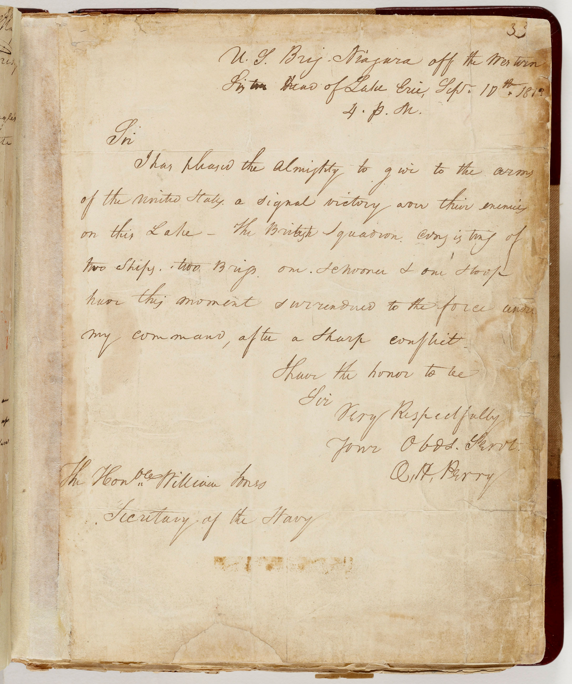 In the middle of the battle, Perry abandoned the Lawrence because it had become disabled and two-thirds of its crew perished. Refusing to surrender, Perry was rowed to the Niagara and then commanded his squadron to an unprecedented victory on September 10, 1813. This letter from Perry to Secretary of the Navy William Jones declares the battle