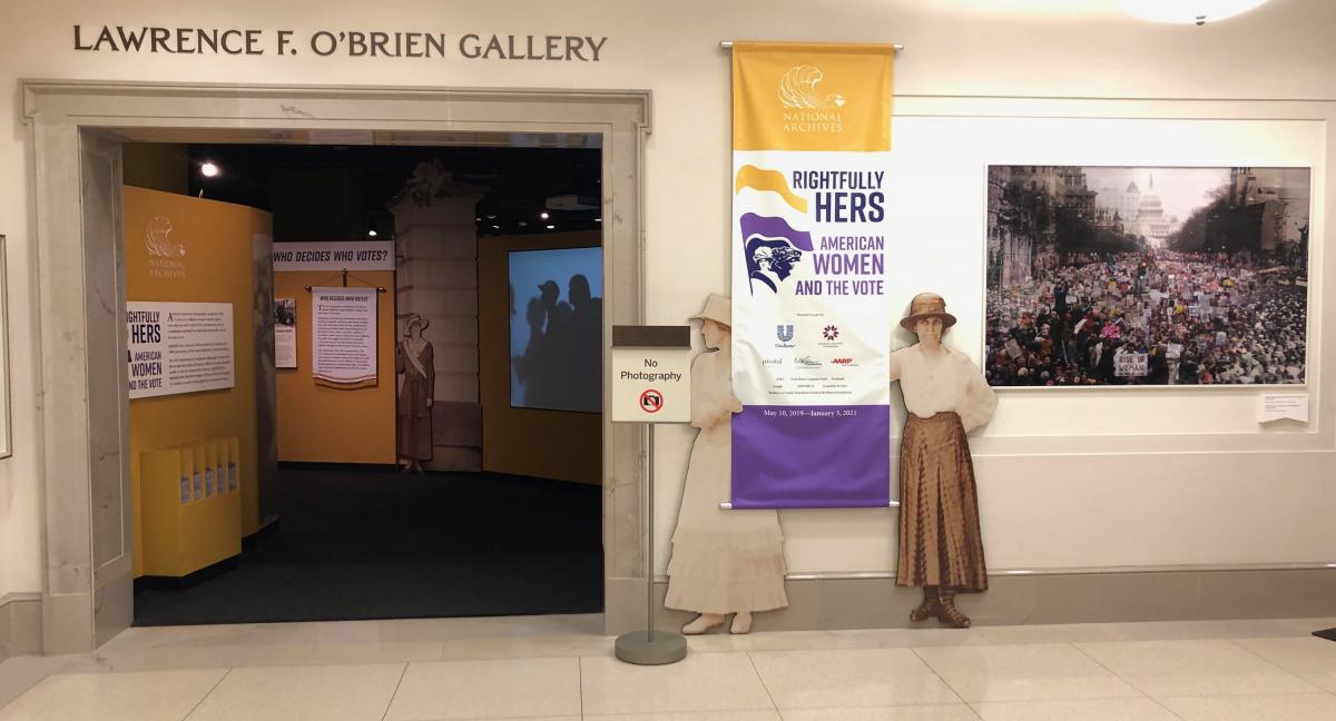 In an elevator lobby promotional display for our current exhibit on the 19th Amendment, we obscured some words on protest signs in a photo of the 2017 Women’s March. This photo is not an archival record held by the National Archives, but one we licensed to use as a promotional graphic. Nonetheless, we were wrong to alter the image.