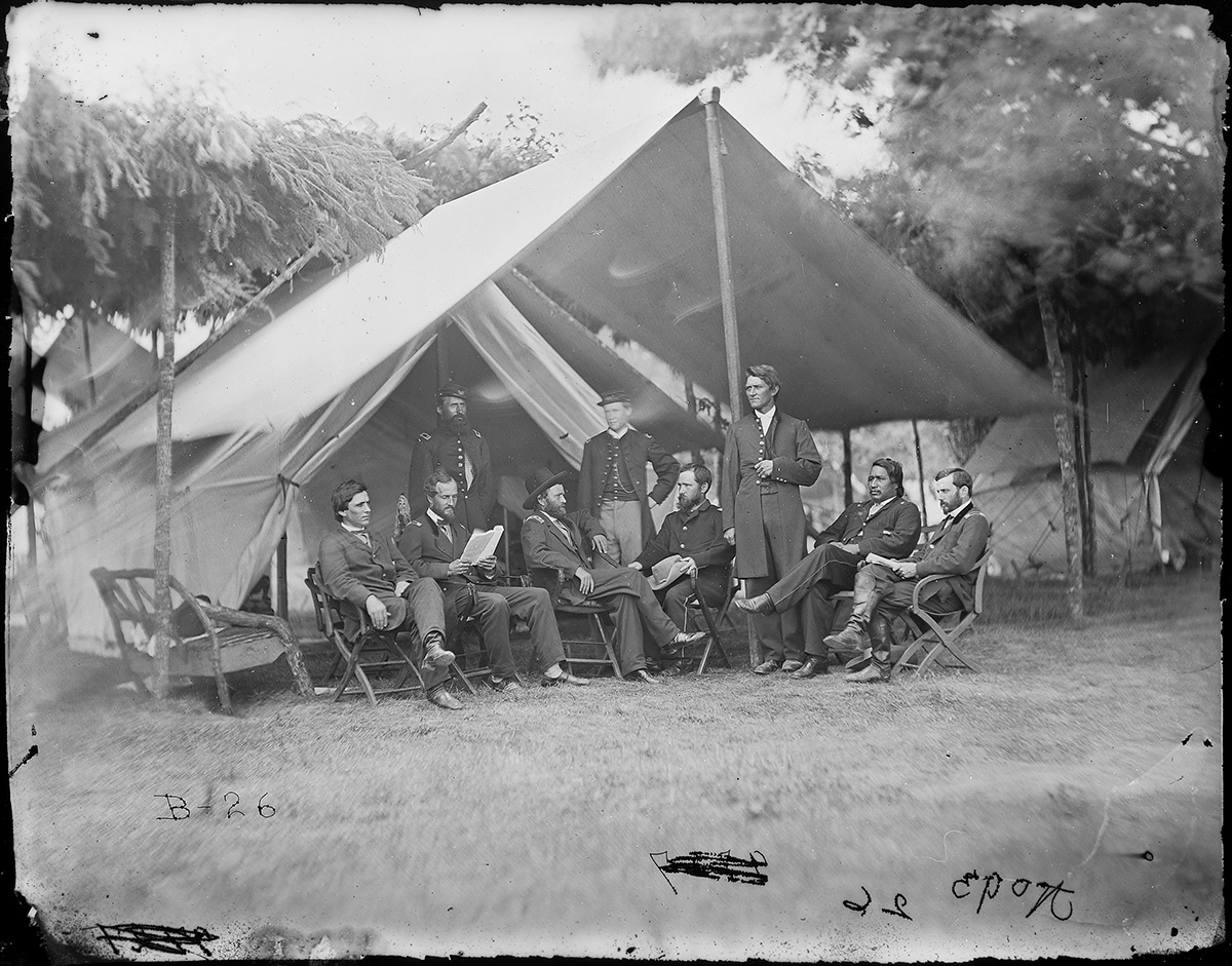 I next turned to the question of where and when this photograph was taken. In my search, I discovered that several versions of this and other Janes photographs exist, and some had dates associated with them. My first attempt, however, led me astray. Captain Janes is listed in the index and shown in volume 10 of Miller’s Photographic History of the Civil War. Janes stands behind and to the left of General Grant in this group photograph entitled “Grant in his Working Clothes.” The caption accompanying the photograph seems to place these officers at Appomattox on April 9, 1865, when General Robert E. Lee surrendered to General Grant.14 No photographers were present at the surrender, however, so this photograph could not have been taken at that time. The ten-volume history’s editor-in-chief, Trevelyan Miller, had merely chosen this image as a cosmetic accent to the section on the surrender.15 Further, even if photographers had been present for the ceremonies in April 1865, Janes would not have been pictured with Grant. By April, he had been in Pennsylvania for eight months. For now, this photograph was of little help.