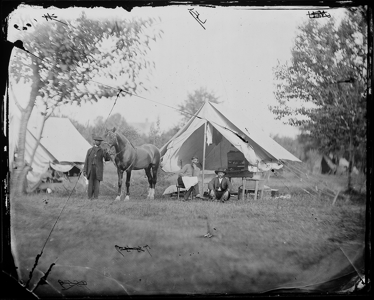 While sifting through photographs at the annual Civil War show in Gettysburg, Pennsylvania, in 1996, I came across an albumen print that sparked my interest. The image itself was unremarkable—a dark-haired Union officer, sporting a kepi on his head and either a newspaper or map in his lap, sits in a camp chair outside his tent, apparently deep in thought. To the right is a man in civilian attire, sitting cross-legged on the ground. To the left is a well-dressed African American man holding the reigns of what is presumably the officer’s horse.1 The mat measures 16¼ by 13¼ inches; the print, 10¾ by 7½. Like so many photographs of the period, it bears the “Brady Washington” imprint. On the lower right-hand corner of the mat, however, is a feature that makes the print very unusual—an inscription that reads, “To Capt Janes with compl of M. B. Brady.” Intrigued by my find, I purchased the print.