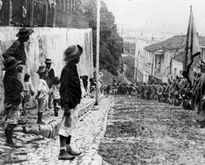 Spanish forces march through the streets of Santiago. (NARA 111-SC-81840)