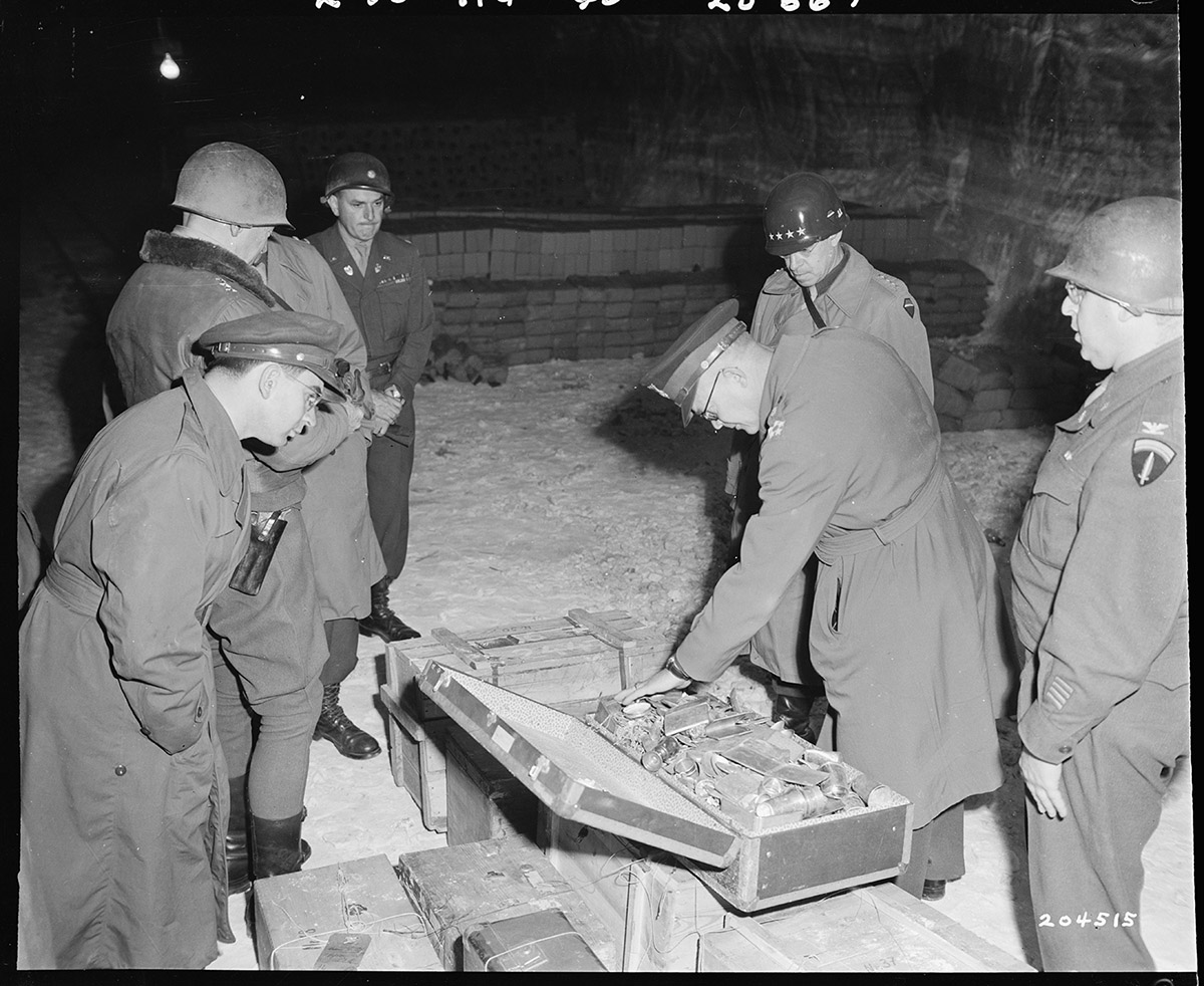 Bernstein also showed the generals the art treasures, plates the Reichsbank used for the printing of the Reichsmark currency, and the currency itself. While they were looking at the latter, a German official said that they were the last reserves in Germany and were badly needed to pay the German army. "I doubt," Bradley interjected, "the German Army will be meeting payrolls much longer." Near the end of the inspection, Bradley said to Patton, "If these were the old free-booting days when a soldier kept his loot you'd be the richest man in the world." Patton just grinned. With that said, the one-hour inspection concluded, and the party, which had included newspapermen and Signal Corps photographers taking numerous photos of the inspection, returned to the surface.(46)