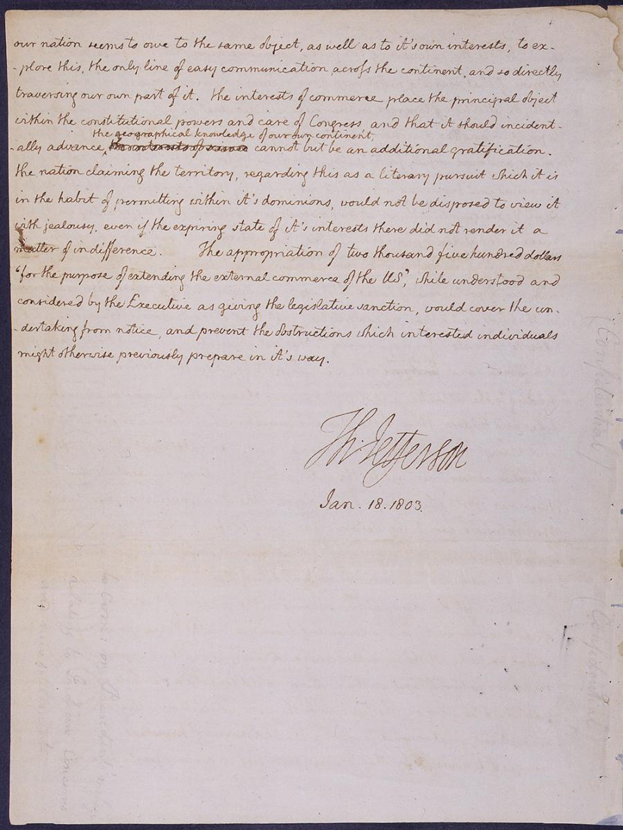 An intelligent officer, with ten or twelve chosen men, fit for the enterprise and willing to undertake it, taken from our posts, where they may be spared without inconvenience, might explore the whole line, even to the Western ocean, have conferences with the natives on the subject of commercial intercourse, get admission among them for our traders as others are admitted, agree on convenient deposits for an interchange of articles, and return with the information acquired in the course of two summers. . . . The interests of commerce place the principal object within the constitutional powers and care of Congress, and that it should incidentally advance the geographical knowledge of our own continent can not but be an additional gratification.