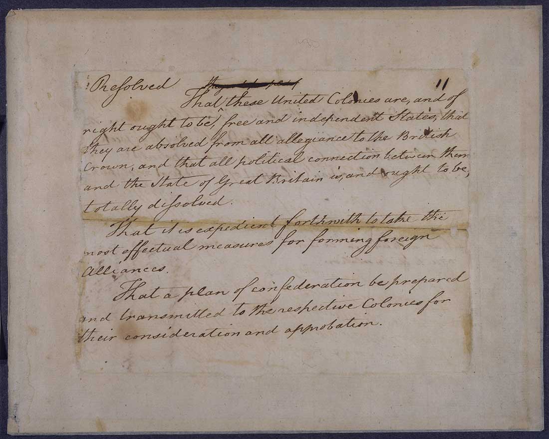 The call for independence—a radical, treasonous move—stated: “Resolved, that these United Colonies are, and of a right ought to be, free and independent States, that they are absolved from all allegiance to the British Crown, and that all political connection between them and the State of Great Britain is, and ought to be, totally dissolved.”