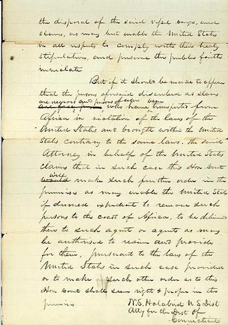 12 The African Captives. Trial of the Prisoners of the Amistad on the Writ of Habeas Corpus, before the Circuit Court of the United States, for the District of Connecticut, At Hartford: Judges Thompson and Judson (1839), in The African Slave Trade and American Courts, pp. 153 - 154; Holabird to Forsyth, Sept. 21, 1839, and Holabird to Forsyth, Sept. 9, 1839, Miscellaneous Letters, May - September 1839, Miscellaneous Letters of the Department of State, 1789 - 1906 (National Archives Microfilm Publication M179, roll 89), RG 59, NARA; indictment, U.S. v. Faquannah and others, September term 1839, U.S. Circuit Court, District of Connecticut, M1753; Holabird to Gilpin, Sept. 6, 1839, Letters Received from U.S. District Attorneys, Marshals, and Clerks of Court, 1801 - 1898, Records of the Solicitor of the Treasury, RG 206, M2012; "The Amistad Prisoners," New York Times and Commercial Intelligencer, Sept. 20, 1839, GLC 00416, the Gilder Lehrman Collection, on deposit at the Pierpont Morgan Library, New York, NY; Notes on indictment, William S. Holabird Papers (Amistad Mutiny Archives), 1829 - 1853, GLC 5636, Gilder Lehrman Collection.