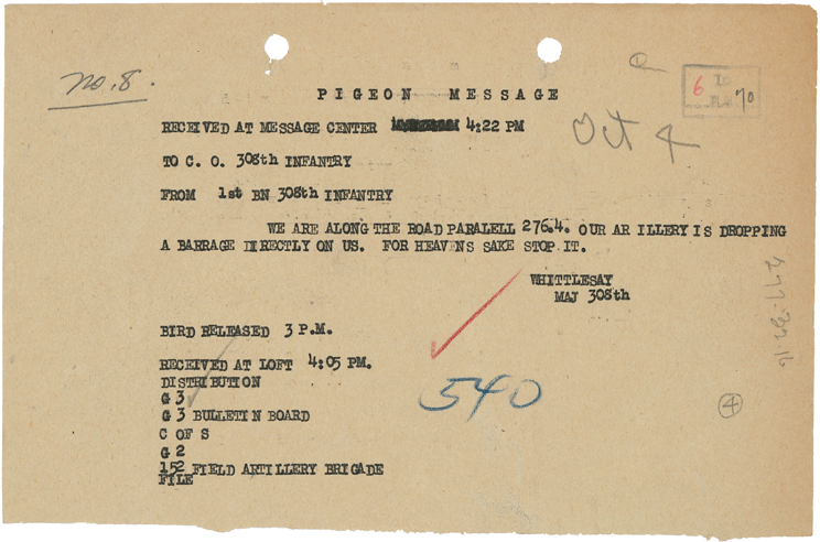 Much briefer, but no less poignant, is a report from the "Lost Battalion." During World War I, the U.S. Seventy-seventh Infantry Division attacked the Germans near Charlevaux, France. Only one unit penetrated enemy lines: Maj. Charles W. Whittlesay's First Battalion of the 308th Infantry Regiment. The battalion was quickly surrounded by Germans—and then came under friendly fire from its own artillery. Whittlesay used his last carrier pigeon to send this three-sentence plea: "We are along the road paralell 276.4. Our artillery is dropping a barrage directly on us. For heavens sake stop it."