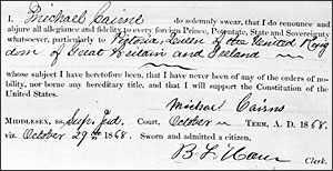 Michael Cairns did not have to file a declaration because he was a Civil War veteran. On some individuals' naturalization petitions, the words "being then a minor under the age of eighteen years" are struck out. This means the applicant was over eighteen when he arrived, and there should be a declaration of intention giving the name of the court and a date of filing. If one arrived before his eighteenth birthday, a declaration would not have been required. In some courts the cut-off age is given as twenty-one.