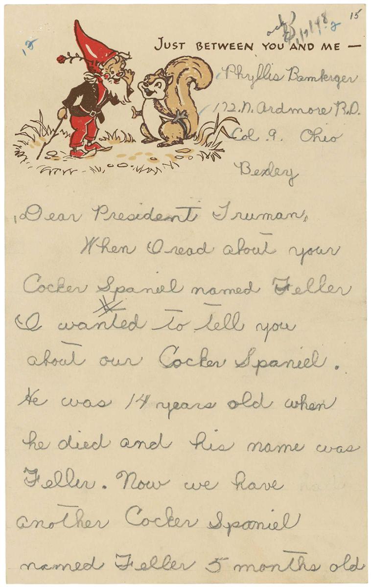 In December 1947, President Harry S. Truman received a crate containing an unsolicited gift—a cocker spaniel puppy named Feller. The news of this gift inspired a letter from Phyllis Bamberger, a young girl in Ohio. Even her stationery, featuring a picture of a leprechaun whispering to a squirrel and a caption declaring "Just Between You and Me," suggests the sense of connection the youngster felt with the President.