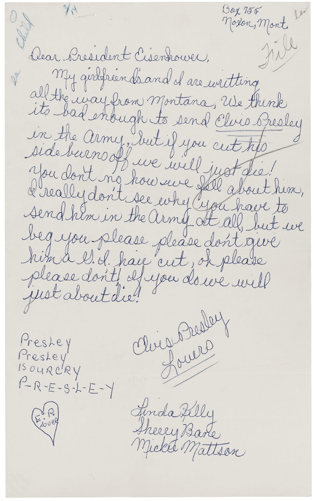 My girlfriend's [sic] and I are writting [sic] all the way from Montana. We think its [sic] bad enough to send Elvis Presley in the Army, but if you cut his sideburns off we will just die! You don't no [sic] how we fell [sic] about him. I really don't see why you have to send him in the Army at all, but we beg you please please don't give him a G.I. hair cut, oh please please don't! If you do we will just about die!
