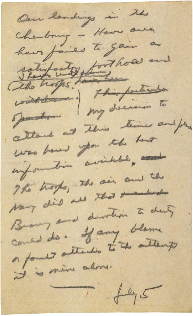 "Our landings in the Cherbourg-Havre area have failed to gain a satisfactory foothold and I have withdrawn the troops. My decision to attack at this time and place was based upon the best information available. The troops, the air and the Navy did all that Bravery and devotion to duty could do. If any blame or fault attaches to the attempt it is mine alone."