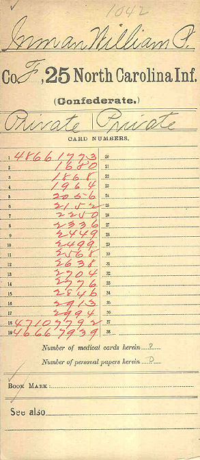 In Record Group 109, War Department Collection of Confederate Records, there is a compiled military service record for a Pvt. William P. Inman who served in Company F, Twenty-fifth North Carolina Infantry Regiment. The first card provides some personal information. His physical description is listed as five feet, seven inches tall with dark hair and a fair complexion. Inman, from Haywood County, North Carolina, was twenty-two years old at the time of his enlistment. He enrolled for duty with Capt. Thomas I. Lenoir's Company of the Twenty-fifth North Carolina State Troops in Haywood County on June 29, 1861. The unit mustered into state service on July 20. Later, Lenoir's company was changed to Company F of the Twenty-fifth North Carolina Infantry Regiment and entered into Confederate service on October 22, 1861, at Camp Davis, near Wilmington, North Carolina.