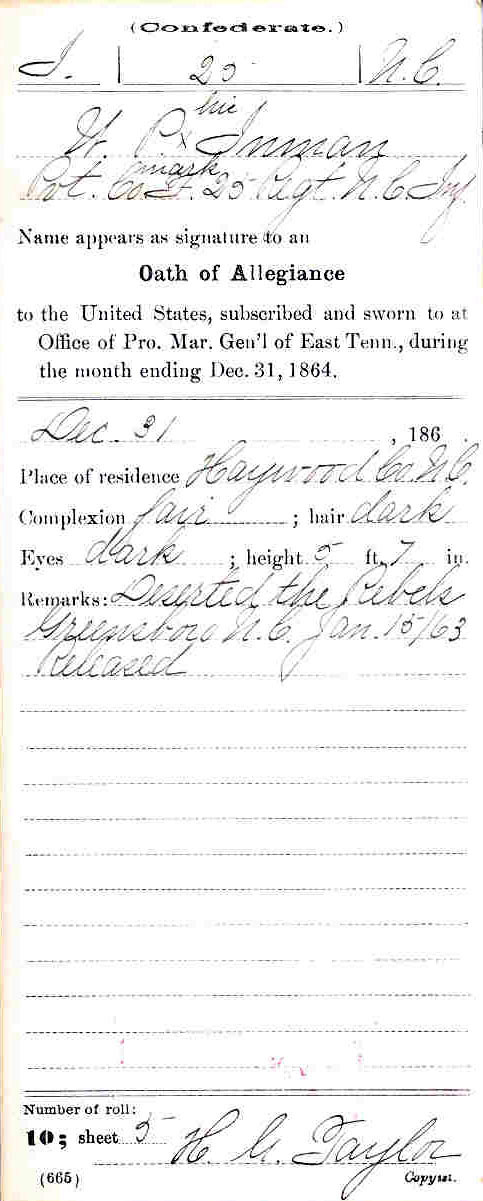 How can that be? According to the previous information in his compiled service record, he was present with his unit for all of 1863 and most of 1864. He was wounded at the Battle of the Crater on July 30, 1864, and his name appears as being present during that action. Why Inman gave this information to the Federal authorities cannot be fully known, for it contradicts information found in the unit muster rolls. Further clues might be revealed if the document related to the oath of allegiance could be located.