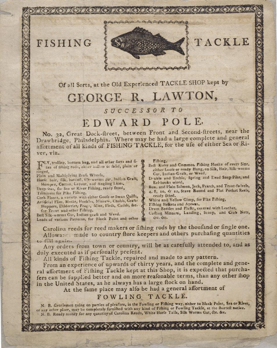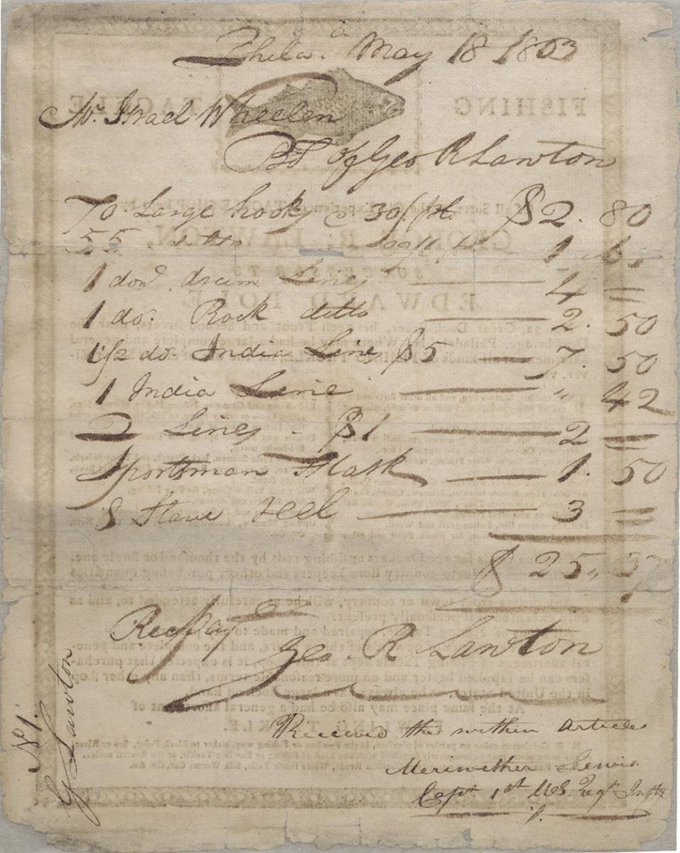 An earlier example is a bill presented to the government by George R. Lawton, an auctioneer from Philadelphia, for supplies used by the Lewis and Clark expedition, dated May 18, 1803. The document lists various articles of fishing tackle that were received by Meriwether Lewis and is written on the back of a printed broadside.
