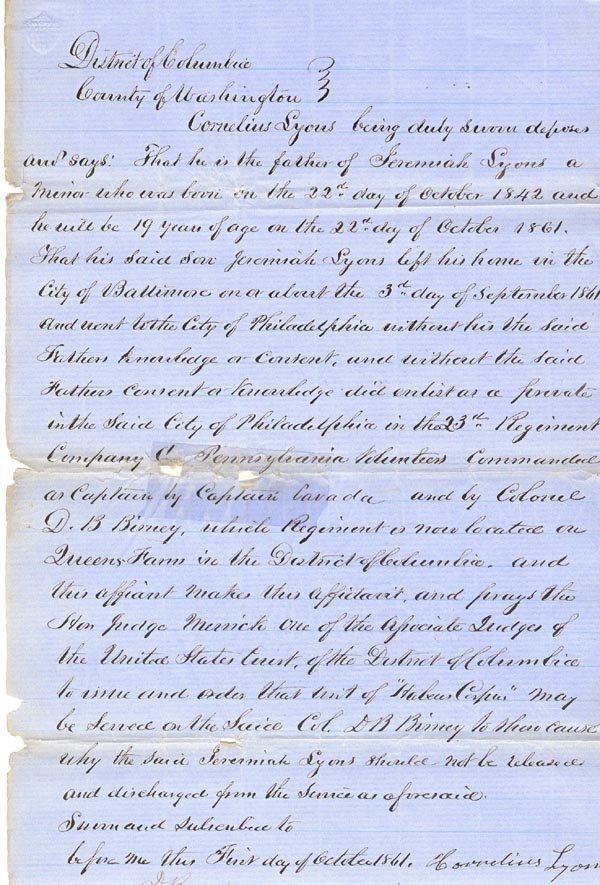 Jeremiah Lyons, an 18-year-old resident of Baltimore, was determined to join the army. Being a minor under the age of 21, he could not legally enlist in the United States Army without the knowledge and consent of a parent or guardian. At the beginning of September 1861, without his father Cornelius's knowledge or consent, Jeremiah left home and traveled to Philadelphia, where he enlisted as a private in the 23rd Regiment, Pennsylvania Volunteers.