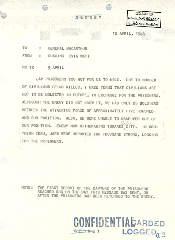About midnight, Cushing informed SWPA that the prisoners were too hot to hold and due to number of civilians being killed he was making terms that civilians were not to be molested in the future in exchange for the prisoners. He noted that his small force of 25 soldiers was unable to stand up against an attacking force of 500, and he pointed out that in southern Cebu some 2,000 Japanese were looking for the prisoners. Again, through delays, this message did not reach Brisbane until April 12, after the prisoners had been returned to the Japanese.