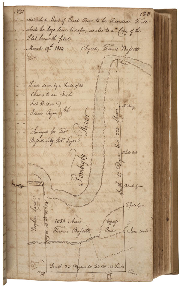 Although some claims offer little more than name of claimant and location of claim, others, such as Thomas Bassett's claims for two properties along the Tombigbee River in the Mississippi Territory (present-day Alabama), contain detailed information on the claimant and his family. In 1804 Bassett petitioned the "Commissioners appointed in pursuance of the act of Congress, passed the third day of March, 1803, for receiving and adjusting the claims to lands south of Tennessee and east of Pearl river" for rights to these two properties that his family had previously owned under British and Spanish grants. As with many land claims presented before boards of commissioners or other federal agencies, the board forwarded the records to Congress. To prove his case, Bassett submitted notarized depositions, translations of Spanish petitions and titles, surveys, and other documents, which supply information on his family dating back to 1780. This documentation accompanying these two claims builds an interesting portrait of the Bassett family.