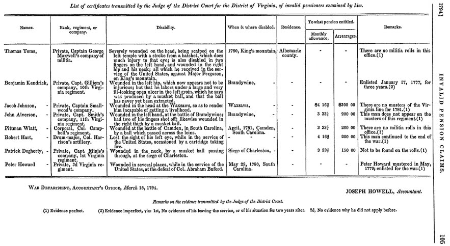 The Claims volume of the American State Papers proves particularly valuable in the case of pre-1800 Revolutionary War pensions. A fire in the War Department on November 8, 1800, destroyed all Revolutionary War pension and bounty land applications that had been submitted up to that date. Much information on these applicants would have been lost were it not for several War Department reports based on original applications that the secretary of war sent to Congress between 1792 and 1795. The lists for 1792, 1794, and 1795 are printed in the Claims volume and contain name, rank, disability, date and location where disabled, residence, pension entitlement, and other remarks.