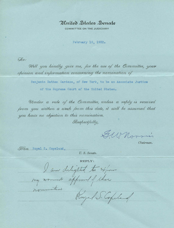 - Frank Porter, Brooklyn, New York, to the Senate Committee on the Judiciary, February 18, 1932; Benjamin Nathan Cardozo File; Papers re Nominations [SEN 72B-A3]; 72nd Congress.