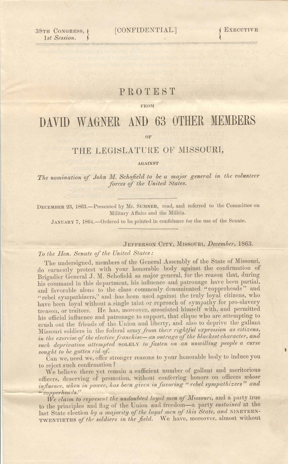 - Petition from members of the General Assembly of Missouri to the U.S. Senate, December 1863; John M. Schofield File; Papers re Nominations [SEN 38B-A4]; 38th Congress.
