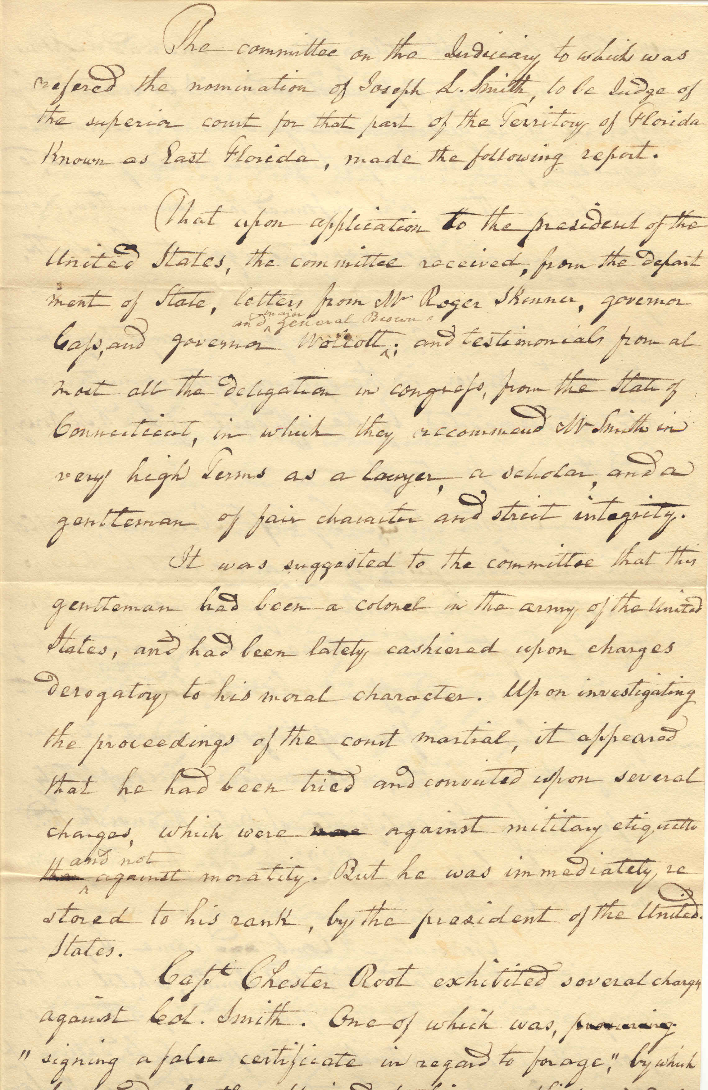 Nomination papers comprise a wide assortment of documents. Early files from 1800 to the 1860s commonly hold handwritten correspondence, both for and against the nominee, notarized affidavits and petitions, and sometimes committee reports. The file of Joseph L. Smith, who was nominated to be judge of the Superior Court for the Territory of Florida in 1822, includes a significant report from the Senate Committee on the Judiciary that swayed the outcome of his nomination. The committee investigated Smith's suitability for office because he had been cashiered from the army on charges derogatory to his moral character. The committee discovered that Smith had in fact been tried and convicted of a dubious count of breeching military etiquette by making false accounts to the government. The charges were subsequently refuted by credible witnesses, and Smith was immediately restored to rank by President James Monroe. Upon that evidence, the committee endorsed Smith's nomination.
