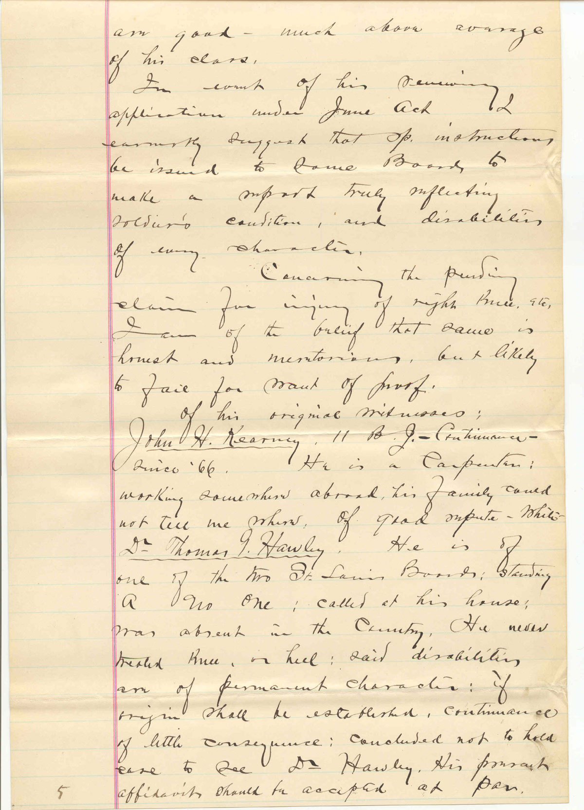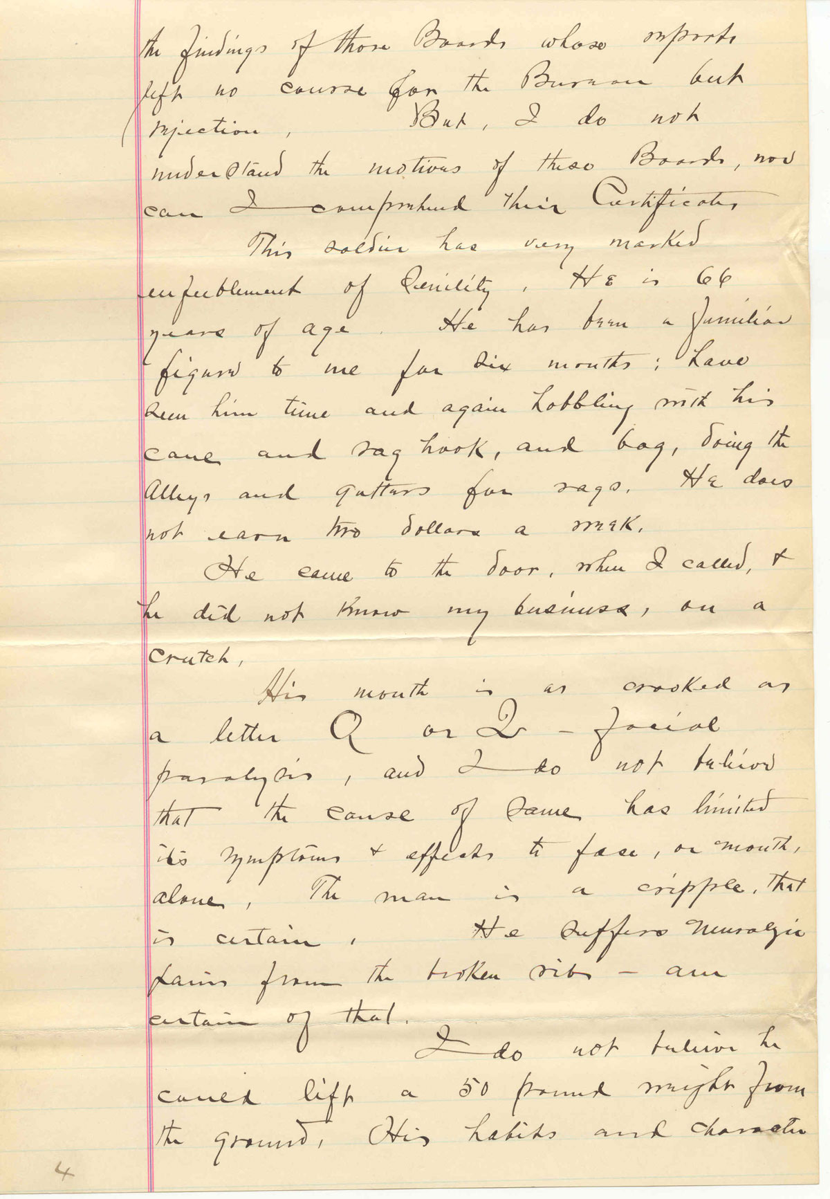 The examiner then went on to castigate the local medical board in St. Louis (one of many nationwide that evaluated all veterans' disability claims for the Pension Bureau) for overlooking the ex-soldier's obvious infirmities. Paine stated, based on his first-person observation of Taylor, that "His mouth is as crooked as letter Q or I—facial paralysis, and I do not believe that the cause of same has limited its symptoms & effects to face, or mouth, alone. The man is a cripple. That is certain. He suffers neuralgia pains from broken ribs—am certain of that."