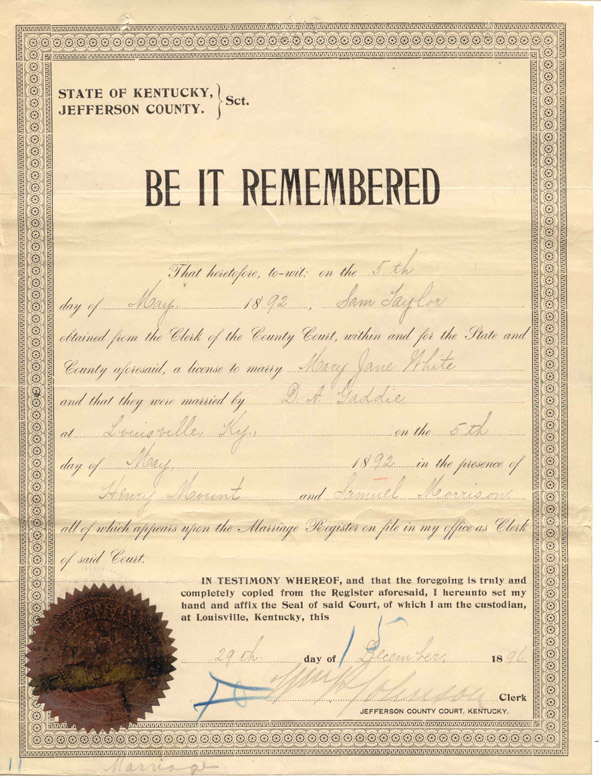 Taylor's contention was absolutely correct under Kentucky law. In that state, couples who wished to legalize their slave marriage were required by an 1866 law to make a written declaration with local authorities to legalize an existing slave marriage. Because Taylor had never ratified her marriage with White, it was never legal, and no divorce was necessary—which also meant she was perfectly free to marry Samuel Taylor. Because Mary Jane and Samuel had taken out a marriage license, her marriage to the veteran was legitimate in the eyes of the federal government, and she was entitled to a pension.